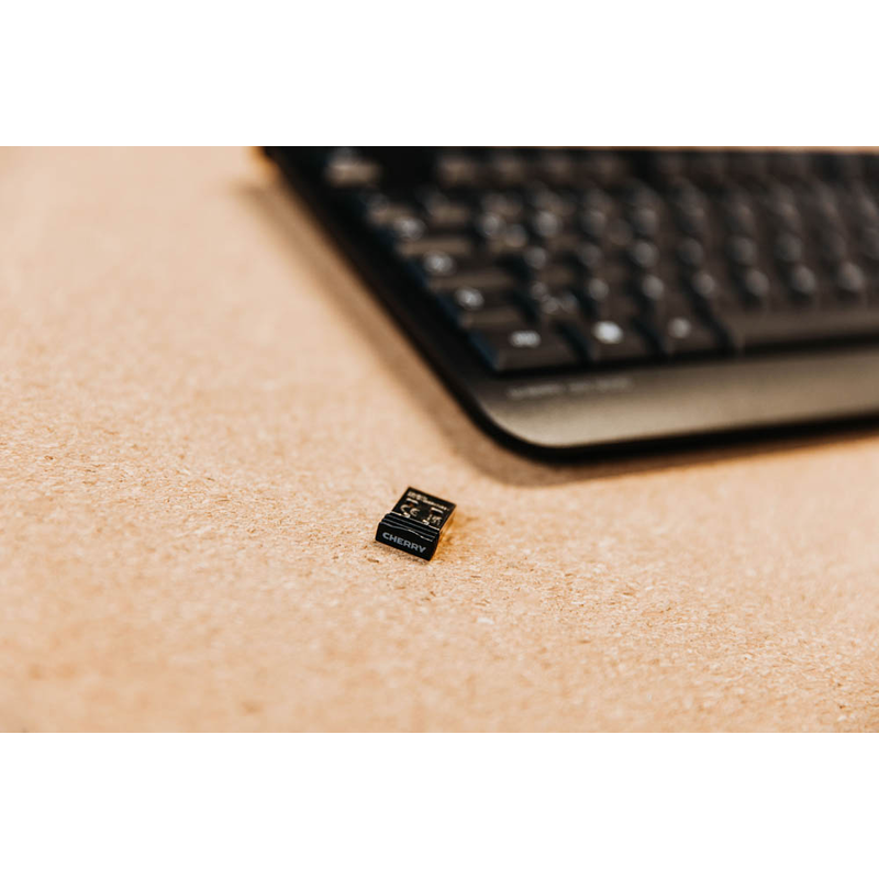 Receiver und Batterie (1x AA) gibt es beim Kauf der CHERRY KW 3000 Tastatur kabellos schwarz mit dazu.