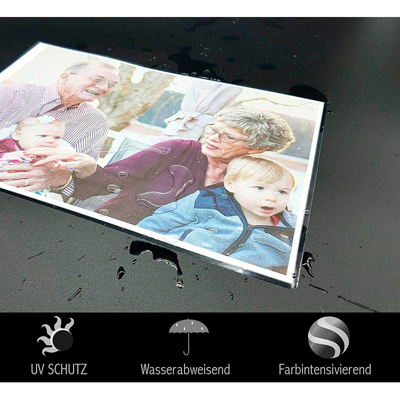 Für eine harmonische Optik sorgen abgerundete Ecken. Die Schweißnaht befindet sich an der kurzen Seite. Dank des integrierten UV-Schutzes wird das Verblassen der Farben auf dem Dokument verhindert. Sie erhalten durch die Laminierung einen Rundumschutz vor Wasser.