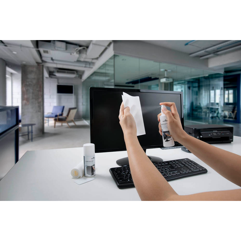 Mit diesem Reinigungs-Set ist ein sauberer Arbeitsplatz garantiert. Mit dem schonenden Schaumreiniger für Kunststoffoberflächen können Sie mühelos Gegenstände wie Ihre Tastatur, Ihren Drucker oder den Rahmen Ihres Bildschirms reinigen. Zusätzlich erhalten Sie ein Pumpspray für die streifenfreie Reinigung Ihrer Bildschirme. In Kombination mit den 10 mitgelieferten fusselfreien Vliestüchern und den 3 Tastaturreinigern haben Staub und Dreck keine Chance mehr.