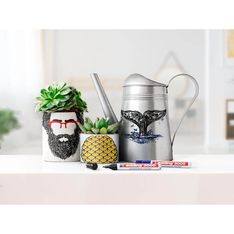 Wir empfehlen Ihnen zum dauerhaften Beschriften, Schreiben oder Markieren die edding 3000 Permanentmarker schwarz 1,5 - 3,0 mm, 10 St. Sie sind unheimlich praktisch und überzeugen dank der vielen tollen Eigenschaften. Vor allem der Einsatz auf den unterschiedlichsten Materialien und die Ergiebigkeit der Tinte machen sie zu einem Must-have in jedem Bereich – egal ob privat oder beruflich. Der Hersteller empfiehlt die Anwendung für fast alle Materialien wie Holz, Metall, Glas, Plastik oder Karton.