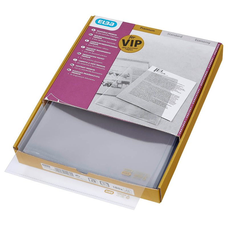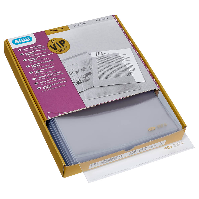 Die 100 ELBA Sichthüllen DIN A4 glasklar glatt 0,14 mm schützen Ihre Unterlagen vor äußeren Einflüssen und sorgen dafür, dass der Inhalt jederzeit sichtbar bleibt. Genau richtig für eine effiziente und saubere Dokumentenpräsentation.