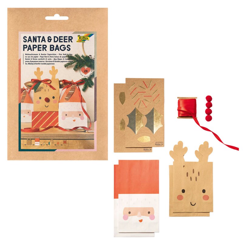 Im Set enthalten sind vier Papiertüten „Santa“, vier Papiertüten „Reindeer“, drei Kraftkartons mit insgesamt 16 vorgestanzten Anhängern, vier rote Pompons und ein Satinband. Damit haben Sie alles zur Hand, um Ihre Geschenke liebevoll zu verpacken.