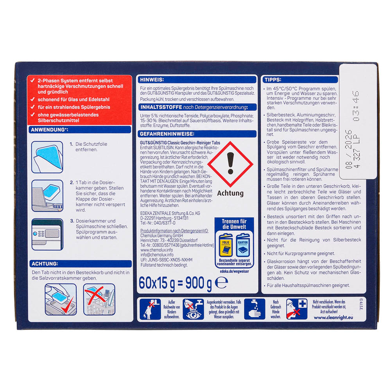 Mit 60 Tabs pro Packung bieten die GUT&GÜNSTIG Spülmaschinentabs CLASSIC eine lange Haltbarkeit und eine sparsame Nutzung. Einfach einen Tab pro Spülgang in die Spülmaschine legen und die Tabs erledigen den Rest – für eine mühelose Reinigung.