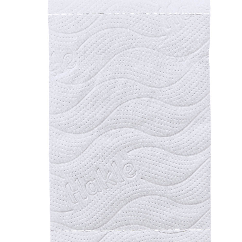 Das Produkt wurde aus Zellstoff hergestellt. Das sogenannte Tissue-Material bietet eine ausgewogene Kombination zwischen Festigkeit und Weichheit, was es zu einer beliebten Wahl macht. Die Prägung des Motivs Hakle dient nicht nur der Ästhetik, sondern sorgt auch für eine bessere Struktur, mehr Reißfestigkeit und dafür, dass die einzelnen Lagen besser zusammenhalten.