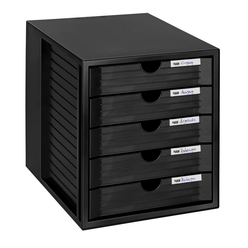 Die HAN Schubladenbox System-Box schwarz 1450-13, DIN A4 mit 5 Schubladen eignet sich hervorragend zum Sortieren und Ablegen Ihrer Unterlagen. Legen Sie Ihre Dokumente bis zum DIN A4 Format schnell ein und entnehmen Sie sie ebenso schnell wieder.