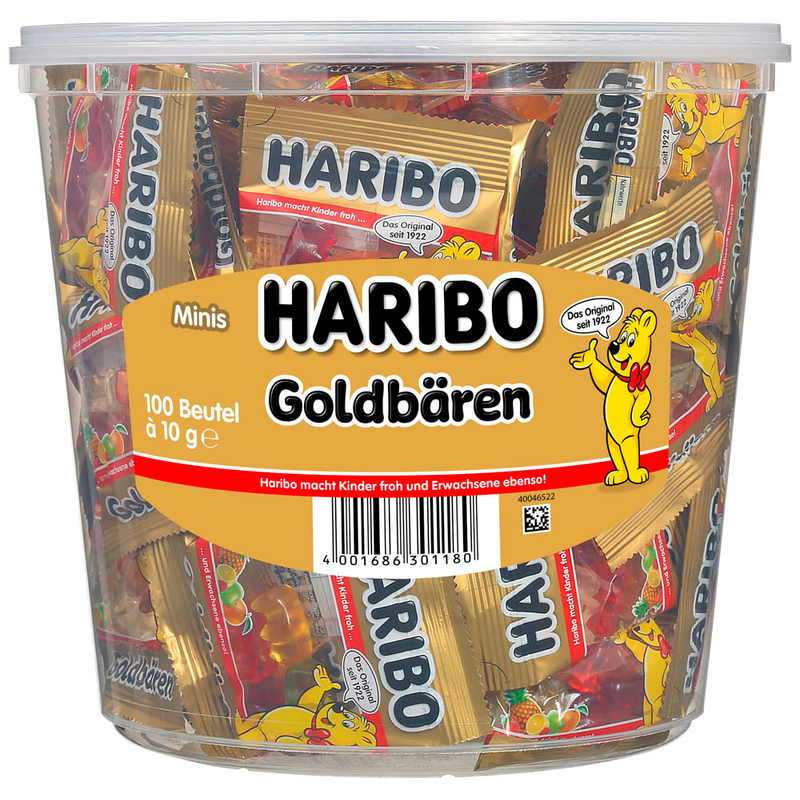 Manchmal braucht man im Alltagsstress - ob geschäftlich oder privat - ein wenig Nervennahrung. Die Original HARIBO GOLDBÄREN Fruchtgummi im Minibeutel sind für diesen Job geradezu prädestiniert. Denn diese Fruchtgummi sind mit ihrem fruchtigen Geschmack bärige Muntermacher für zwischendurch. Werfen Sie andere Gute-Laune-Strategien einfach über Bord und greifen Sie zu einem der 100 Minibeutel der GOLDBÄREN Fruchtgummi in der Klarsichtdose. Schwelgen Sie in Kindheitserinnerungen und gehen Sie mit neuem Elan ans Werk. Oder reichen Sie den legendären Fruchtgummi einfach Ihren Geschäftspartnern beim nächsten Meeting und sorgen Sie damit für gute Laune!