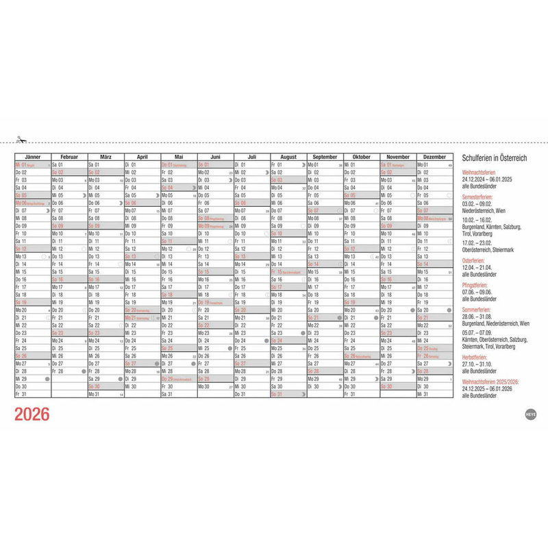 So ist der Heye Tischquerkalender Wochenplanung 2026 aufgebaut: 2 Seite Monatsübersicht aktuelles Jahr und Schulferien, 56 Seiten Kalendarium, 1 Woche 1 Seite, 1 Seite Monatsübersicht Folgejahr.