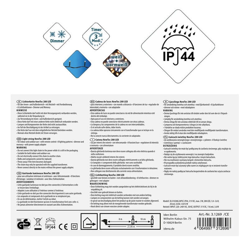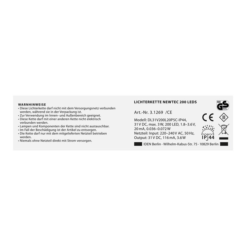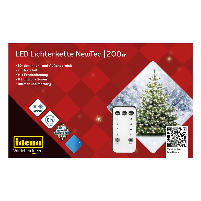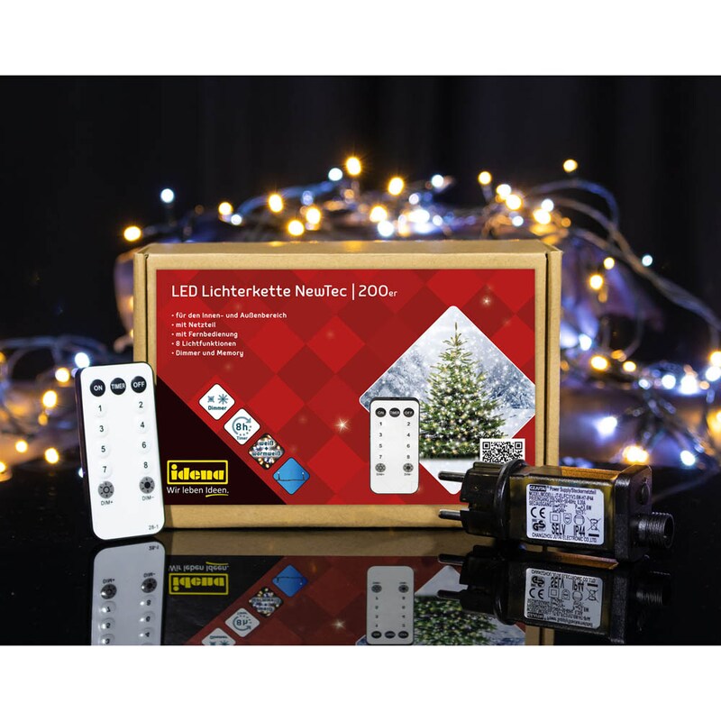 Die Idena NewTec 200er LED Lichterkette grün 27,9 m ist in der Weihnachtszeit ein echtes Highlight und sorgt bestimmt für festliche Stimmung. In dieser Ausführung kommt das Modell zu Ihnen: 200 warmweiße und weiße LEDs, für den Innen- und Außenbereich.