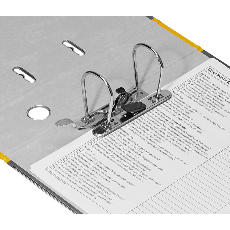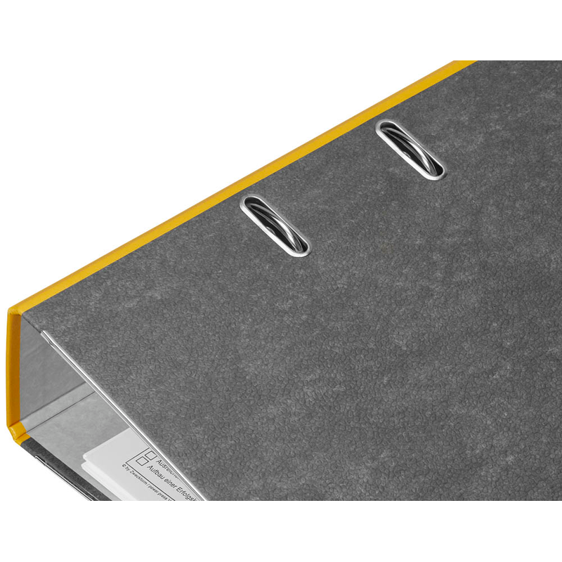 Sichtbar nach außen ist nach dem Verstauen häufig nur der Ordnerrücken. Durch das aufgeklebte und beschriftbare Rückenschild haben Sie immer den Überblick über den Ordnerinhalt. Egal, ob Sie Ihre Unterlagen projekt-, auftrags- oder auch kundenbezogen ablegen wollen – die Rückenfarbe in gelb unterstützt Sie bei der Aufteilung. Wenn der Ablagehelfer dicht gedrängt oder in schwer erreichbaren Höhen steht, können Sie ihn dank seines Grifflochs einfach aus seinem Fach entnehmen.