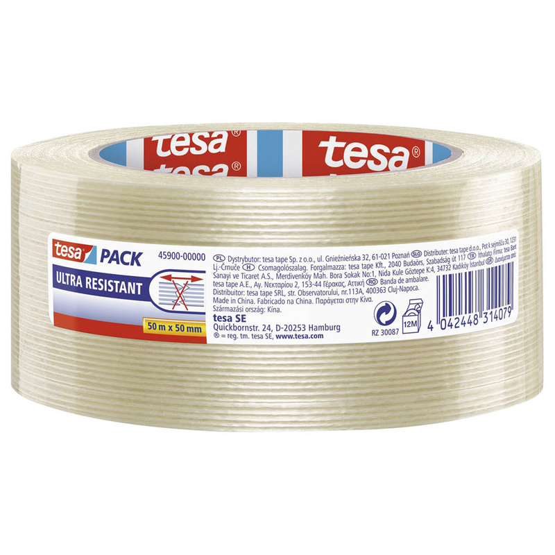 Das transparente Packband tesapack® 45900 Ultra Resistant hat eine Breite von 50,0 mm und eine Länge von 50,0 m. Der Kerndurchmesser beträgt 7,6 cm. Es besteht aus einem mit Glasfasern und PET und einem Klebstoff aus Synthesekautschuk. Das Packband hat dadurch eine gute längsläufige Zugfestigkeit und dehnt sich dabei nicht.