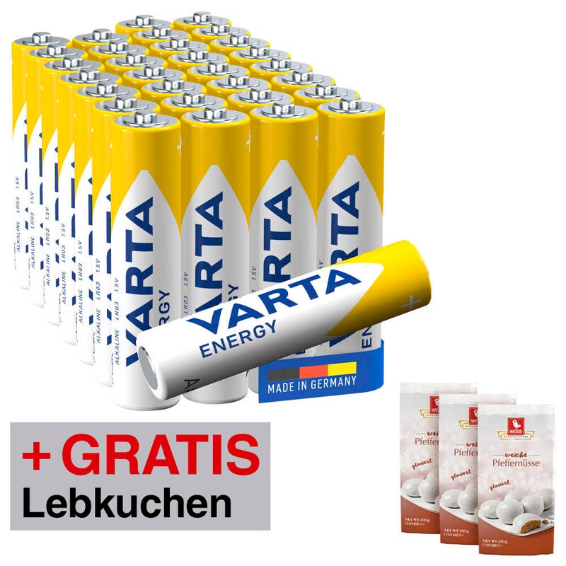AKTION: 30 VARTA Batterien ENERGY Micro AAA 1,5 V + GRATIS 3x WEISS Pfeffernüsse 200 g