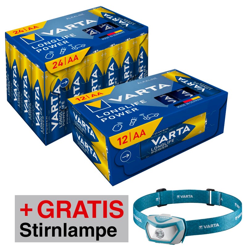 AKTION: 36 VARTA Batterien LONGLIFE Power Cube Mignon AA 1,5 V + GRATIS VARTA Stirnlampe Outdoor H10 Pro